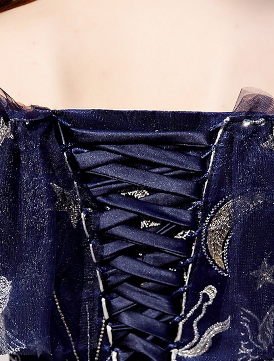 A-Line Fairy Prom Dress Sparkle Party Dress Off Shoulder Short Sleeve Floor Length Tulle with Sequins Embroidery