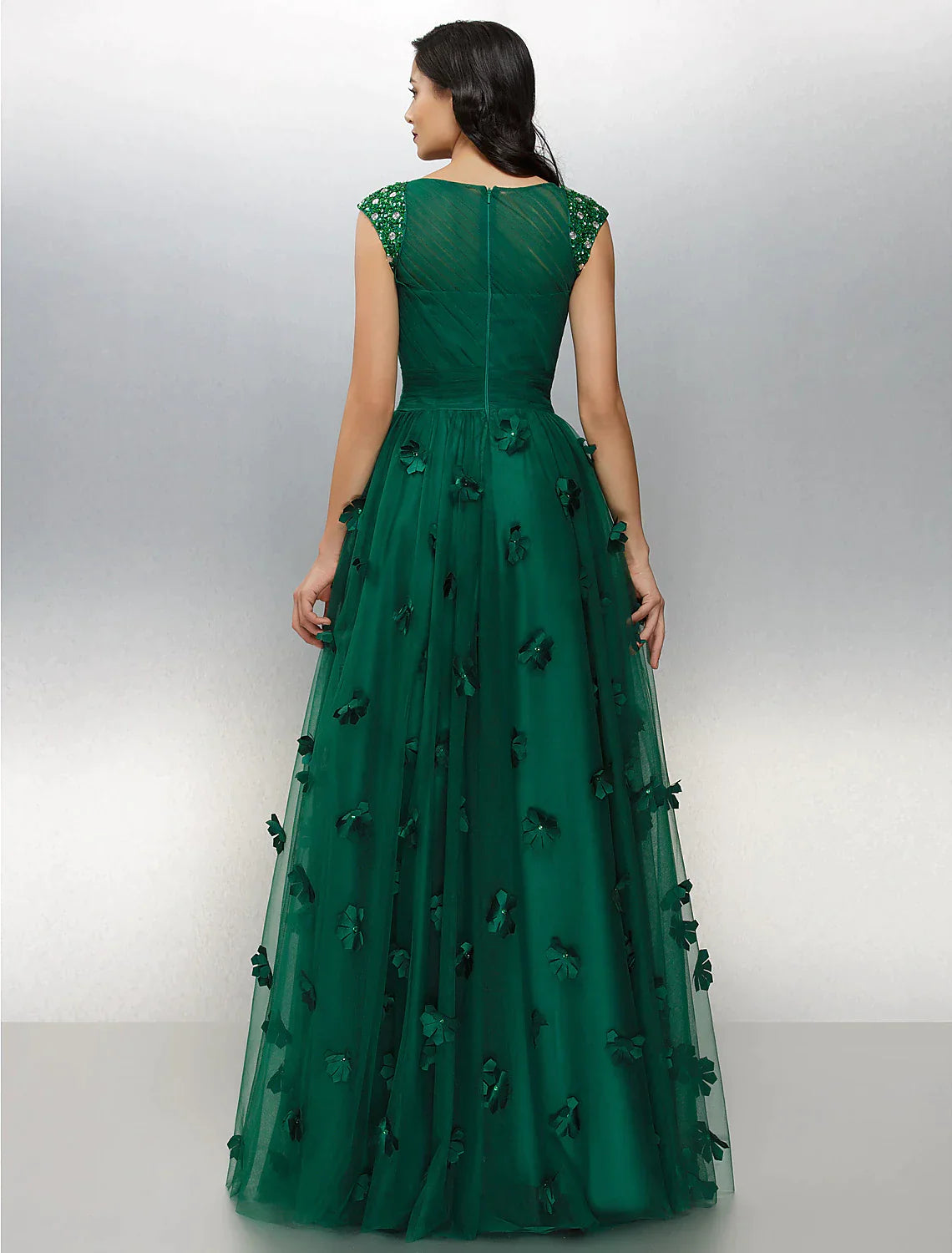 A-Line Floral Dress Wedding Guest Floor Length Short Sleeve Boat Neck Tulle with Crystals Appliques