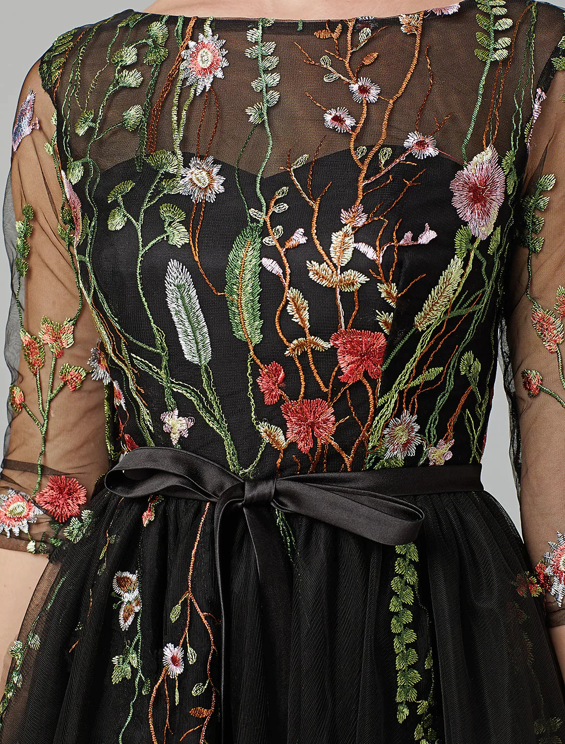 A-Line Little Black Prom Dress Wedding Guest Knee Length Long Sleeve Neck Addams Tulle with Embroidery Appliques