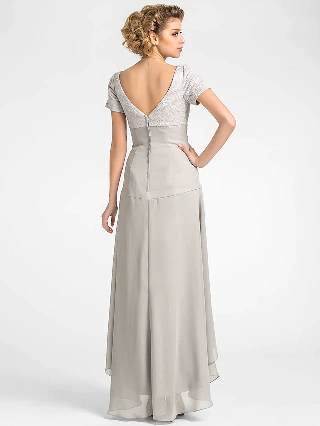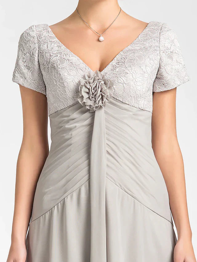 A-Line Mother of the Bride Dress Floral High Low V Neck Asymmetrical Chiffon Lace Short Sleeve with Pleats Flower