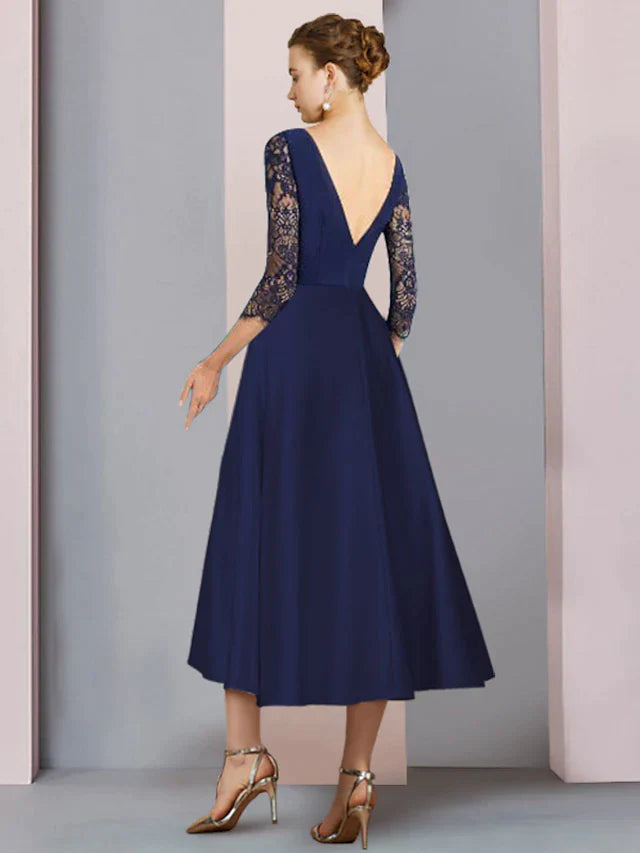 A-Line Mother of the Bride Dress Formal Church Party Elegant Scoop Neck Knee Length Lace Stretch Fabric 3/4 Length Sleeve with Crystal Brooch