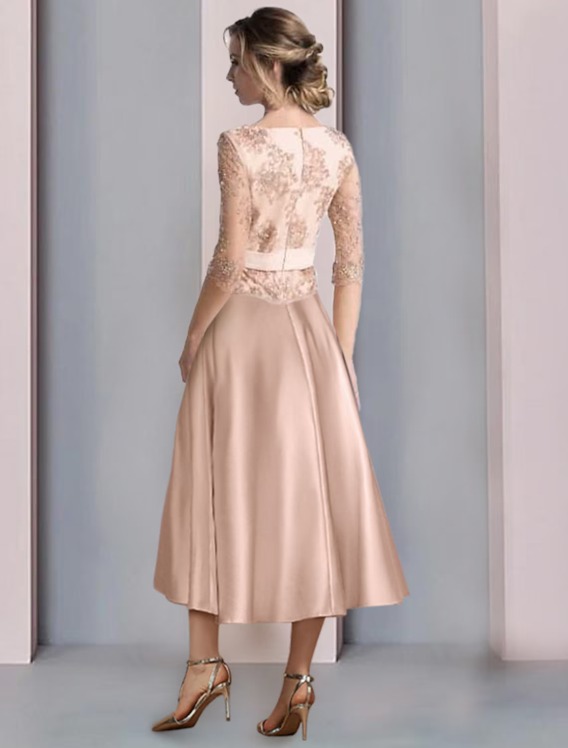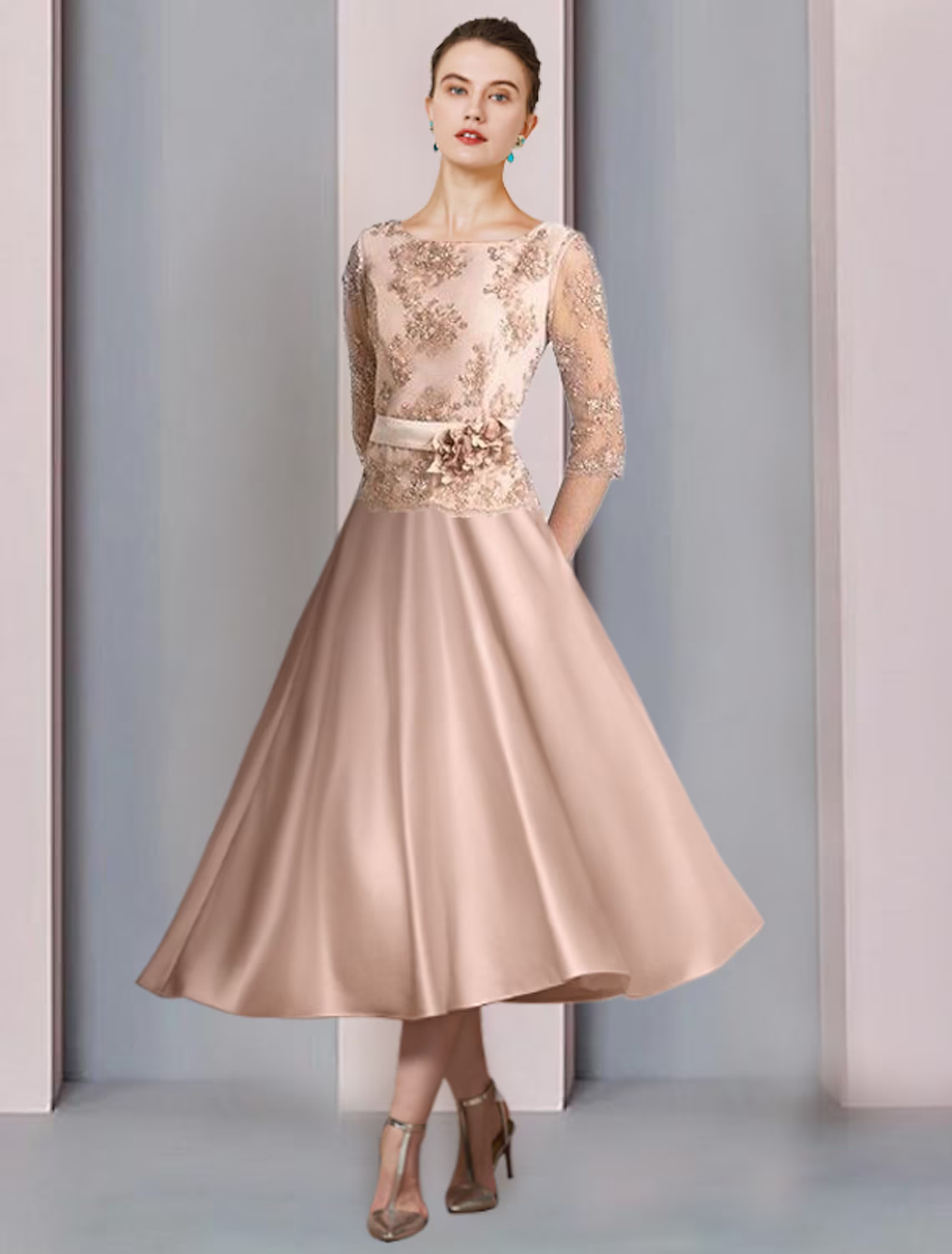 A-Line Mother of the Bride Dress Formal Wedding Guest Vintage Party Elegant Scoop Neck Satin Lace Half Sleeve with Flower