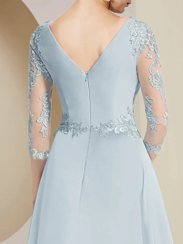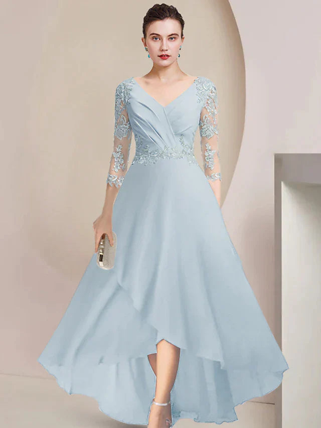 A-Line Mother of the Bride Dress Party Elegant V Neck Asymmetrical Lace Stretch Chiffon 3/4 Length Sleeve with Pleats Ruching