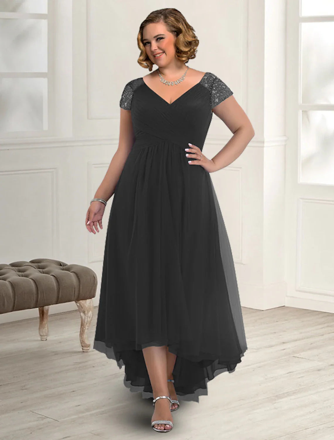 A-Line Mother of the Bride Dress Plus Size Elegant High Low V Neck Asymmetrical Floor Length Chiffon Short Sleeve with Pleats Beading