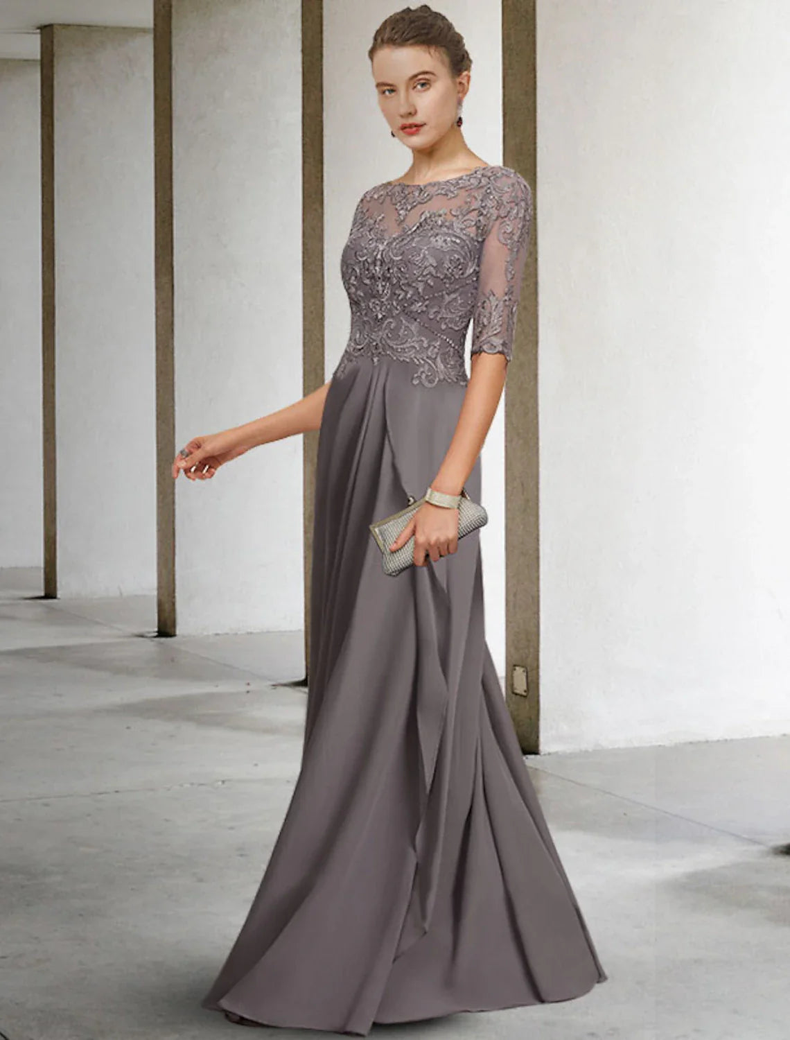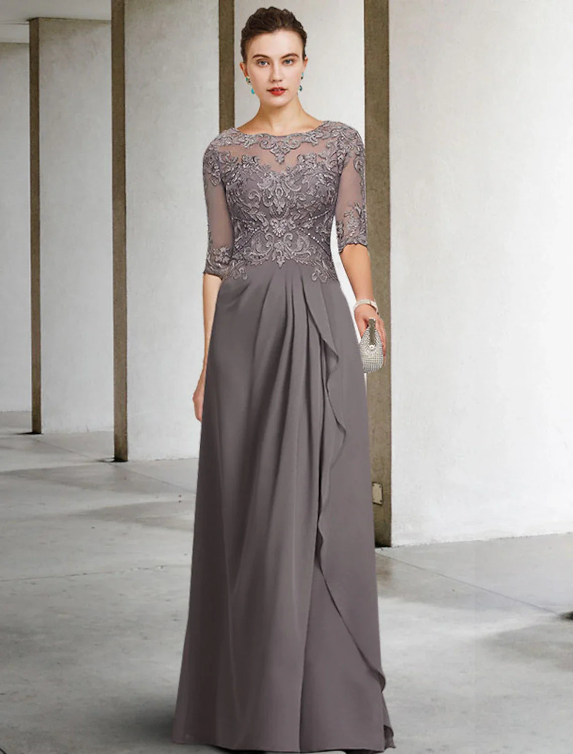 A-Line Mother of the Bride Dress Plus Size Elegant Jewel Neck Floor Length Chiffon Lace Half Sleeve with Pleats Beading Appliques