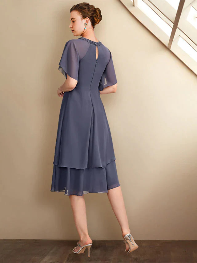 A-Line Mother of the Bride Dress Plus Size Elegant Jewel Neck Knee Length Chiffon Short Sleeve with Beading Ruffles