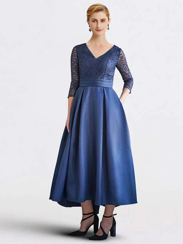 A-Line Mother of the Bride Dress Plus Size Elegant V Neck Tea Length Satin Lace 3/4 Length Sleeve with Ruched