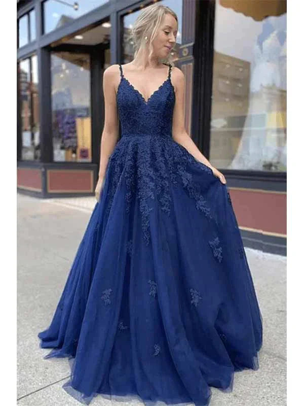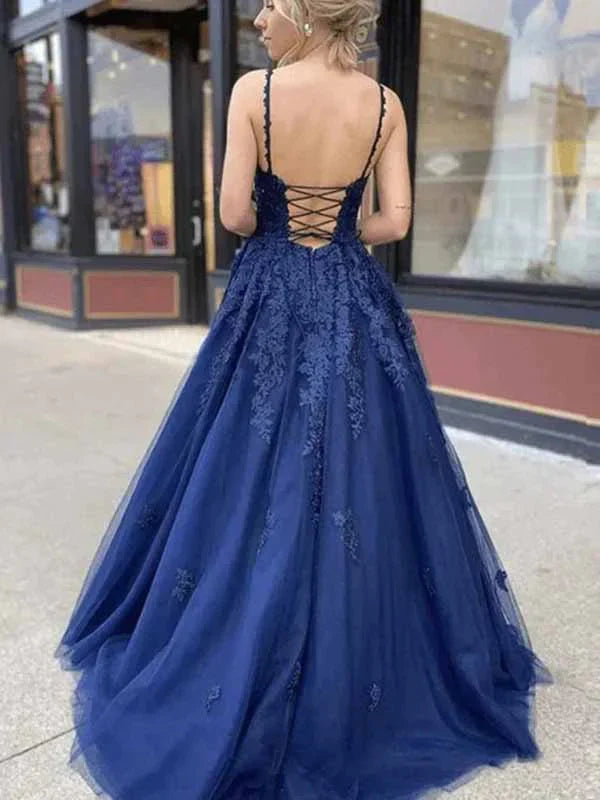 A-line Navy Blue Tulle Lace Long Prom Dress Evening Dress, OL587