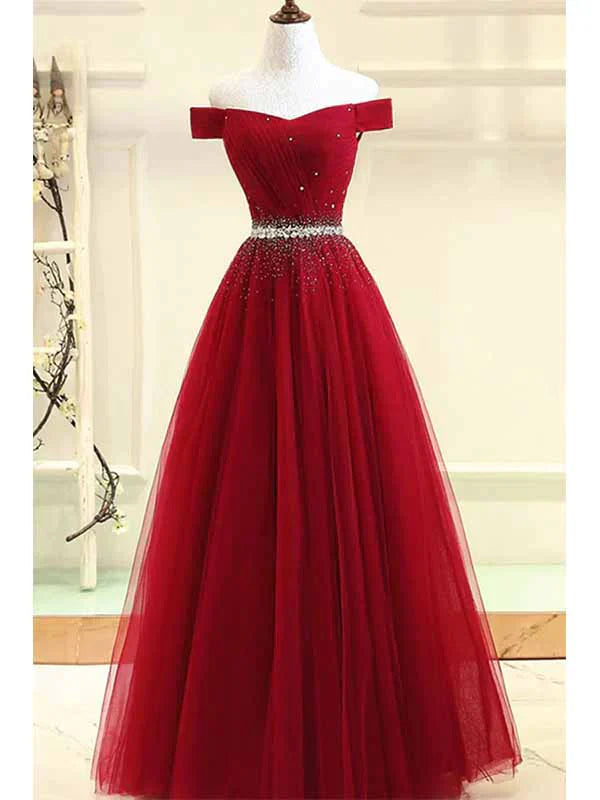 A-line Off the Shoulder Red Tulle Prom Dress Evening Dress with Beading, OL588