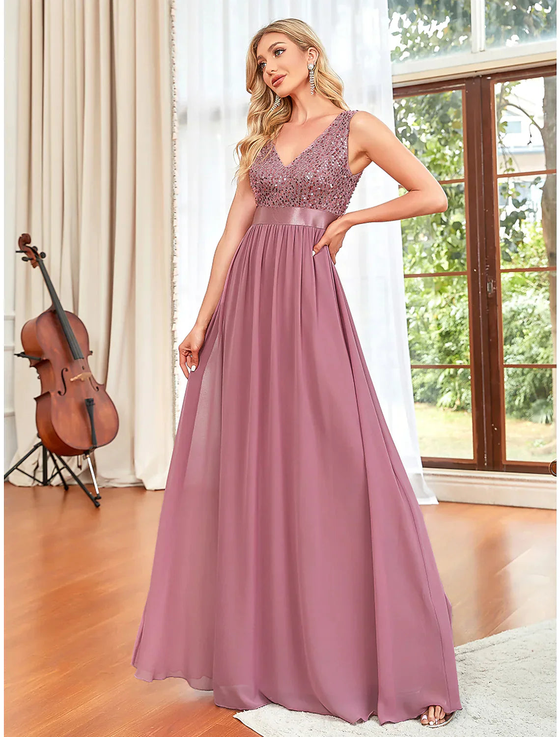 A-Line Prom Dresses Elegant Dress Wedding Guest Floor Length Sleeveless V Neck Chiffon V Back Draping