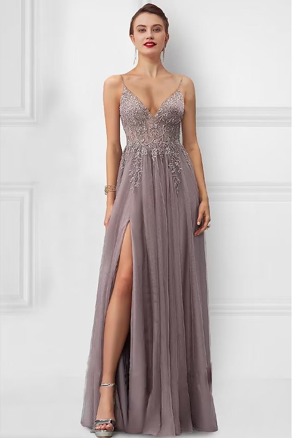 A-Line Prom Dresses Floral Dress Party Wear Floor Length Sleeveless Strap Tulle with Slit