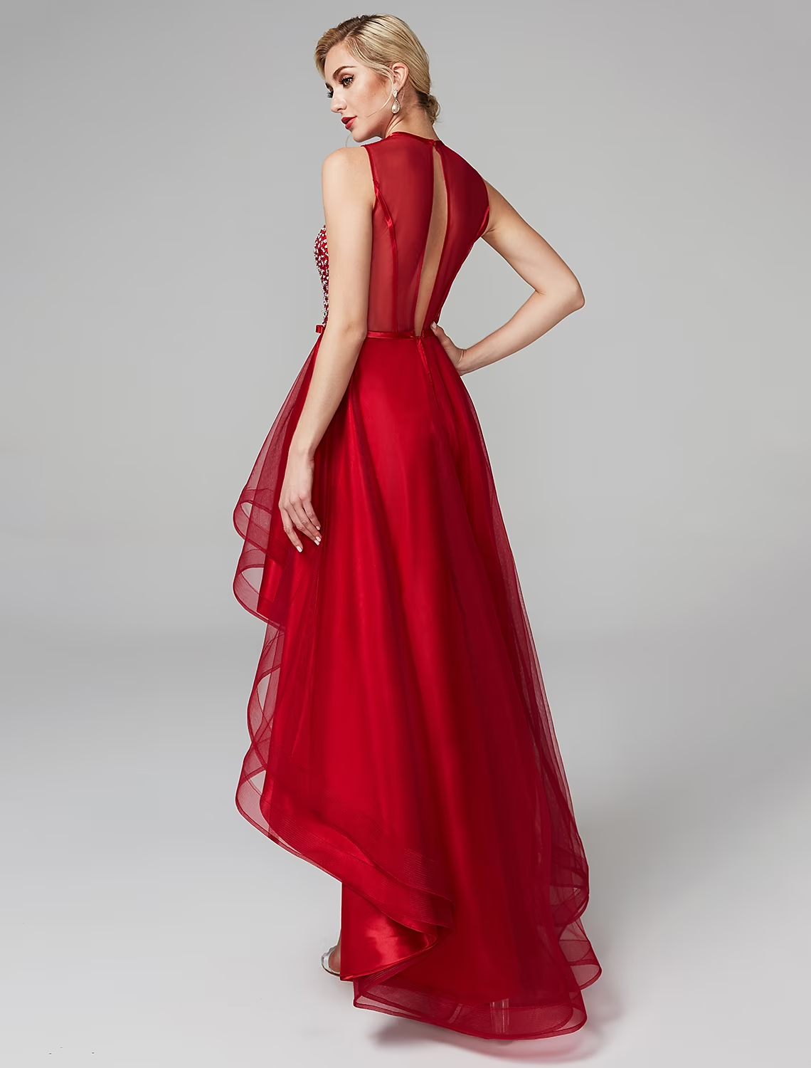 A-Line Sparkle & Shine Dress Wedding Guest Asymmetrical Sleeveless Jewel Neck Satin with Bow(s) Sequin