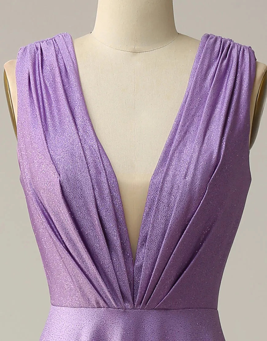 A-Line V-Neck Long Glitter Prom Dress With Pleating Pure Color