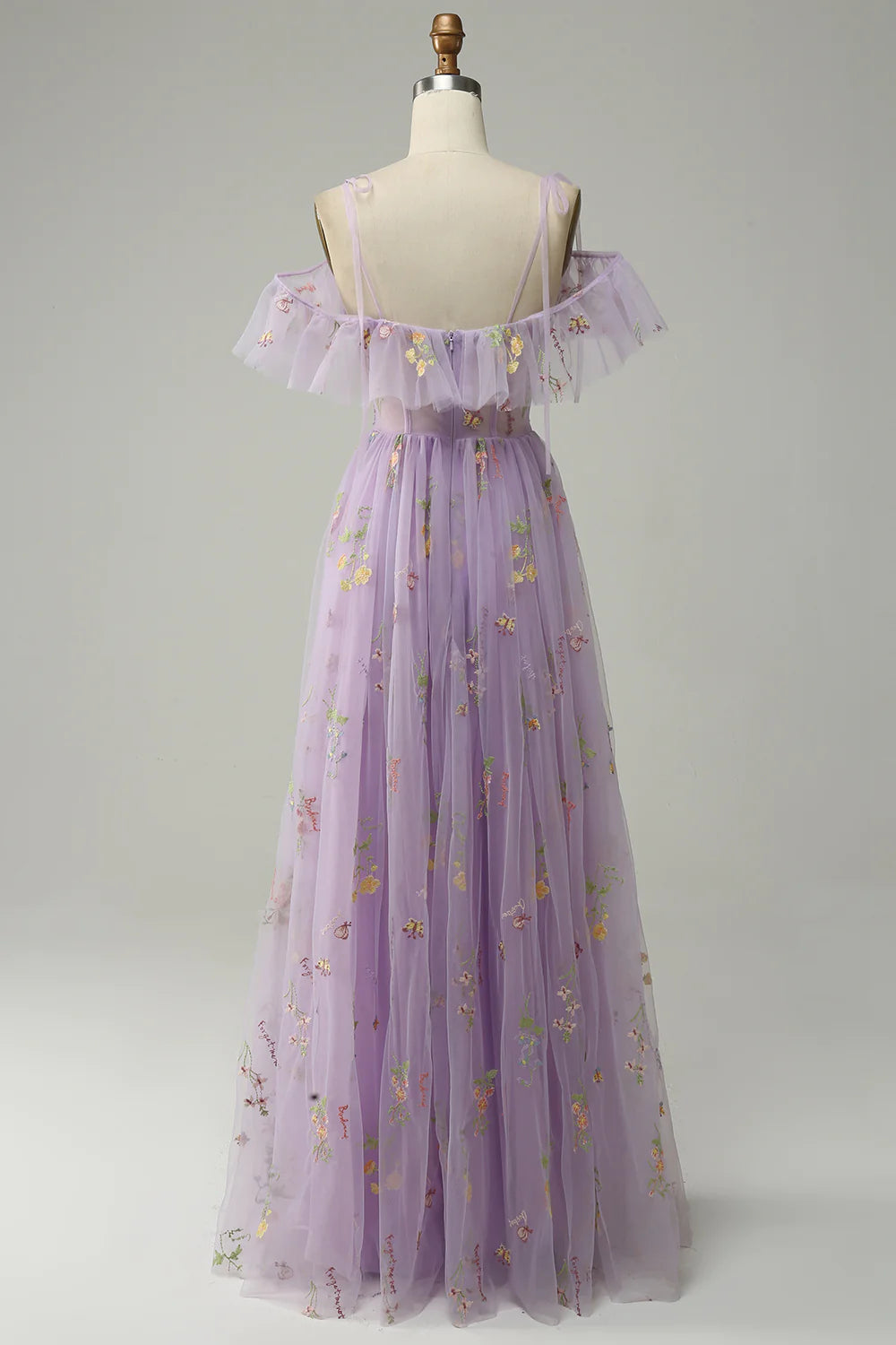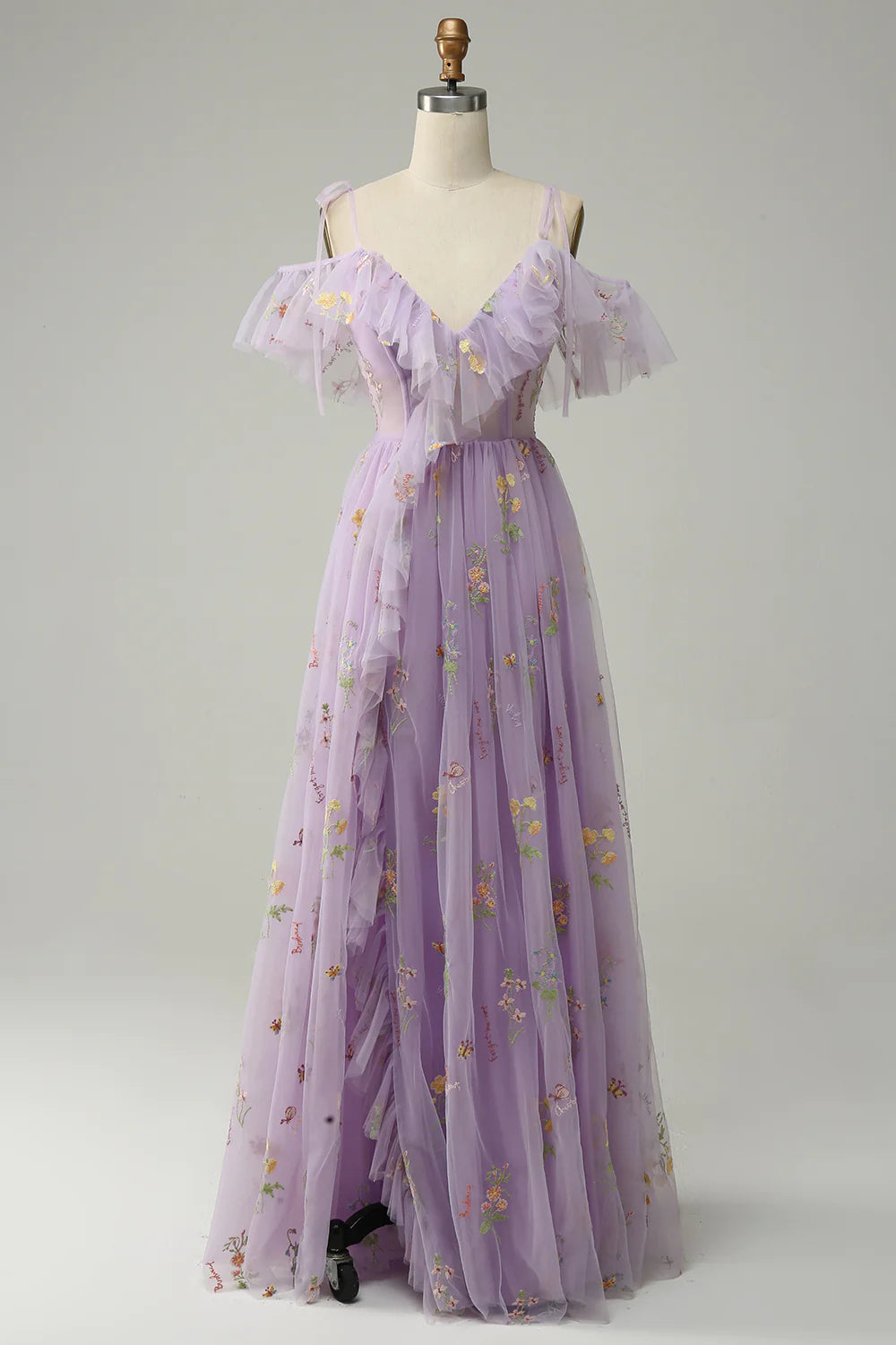 A-Line V-Neck Spaghetti Straps Embroidery Grey Blue Long Prom Dress with Slit Sexy