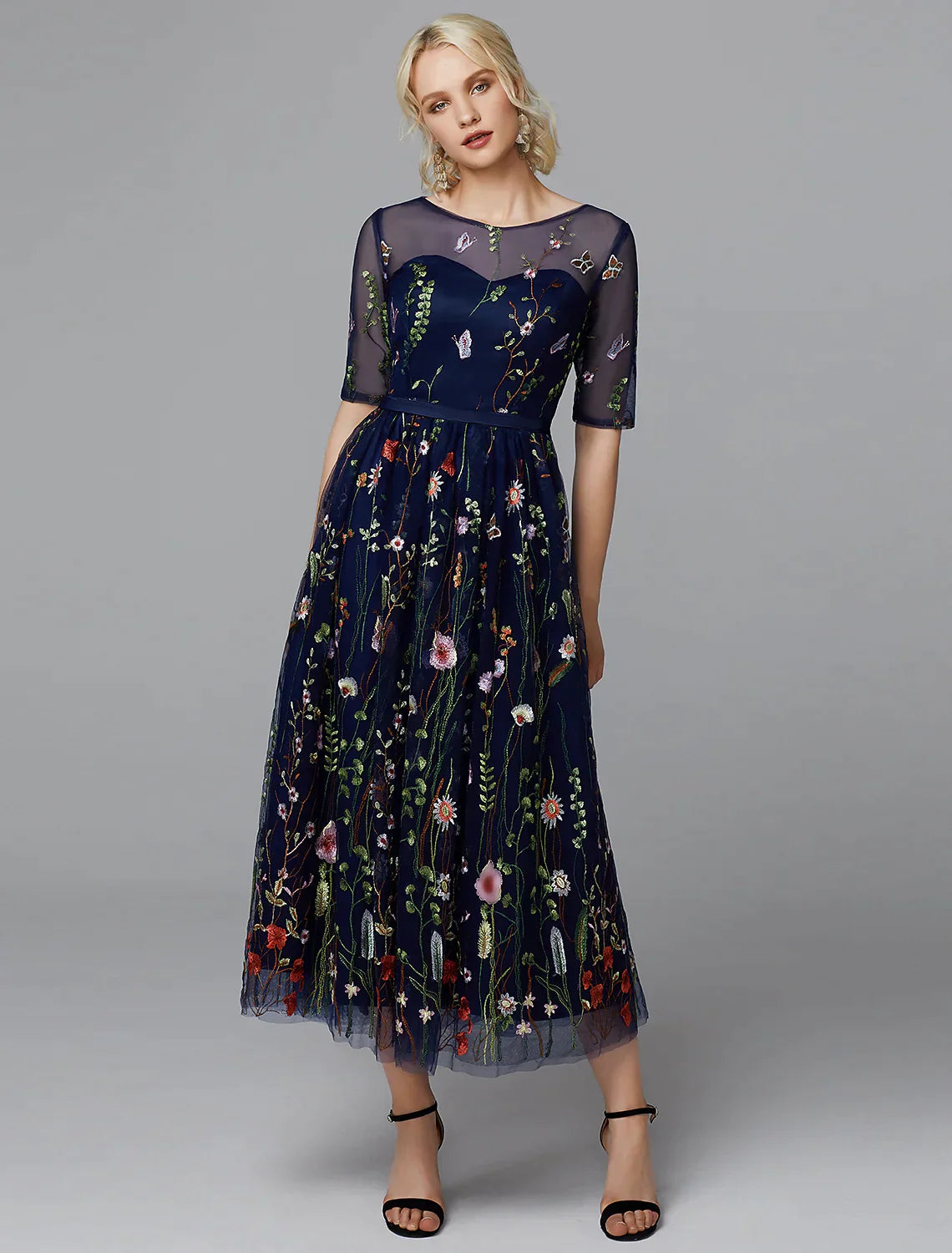 A-Line White Dress Holiday Half Sleeve Lace with Embroidery Appliques