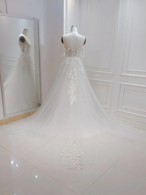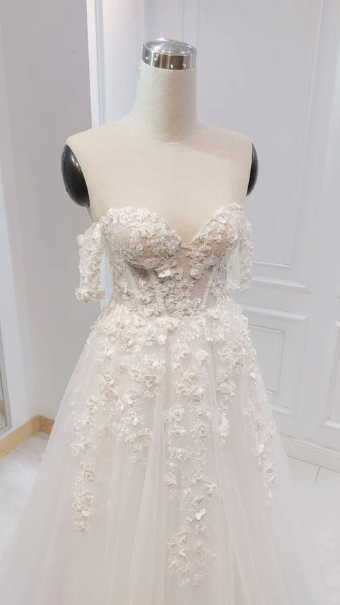 A-line White Off the Shoulder Wedding Dress With Flower Embroidery Beautiful