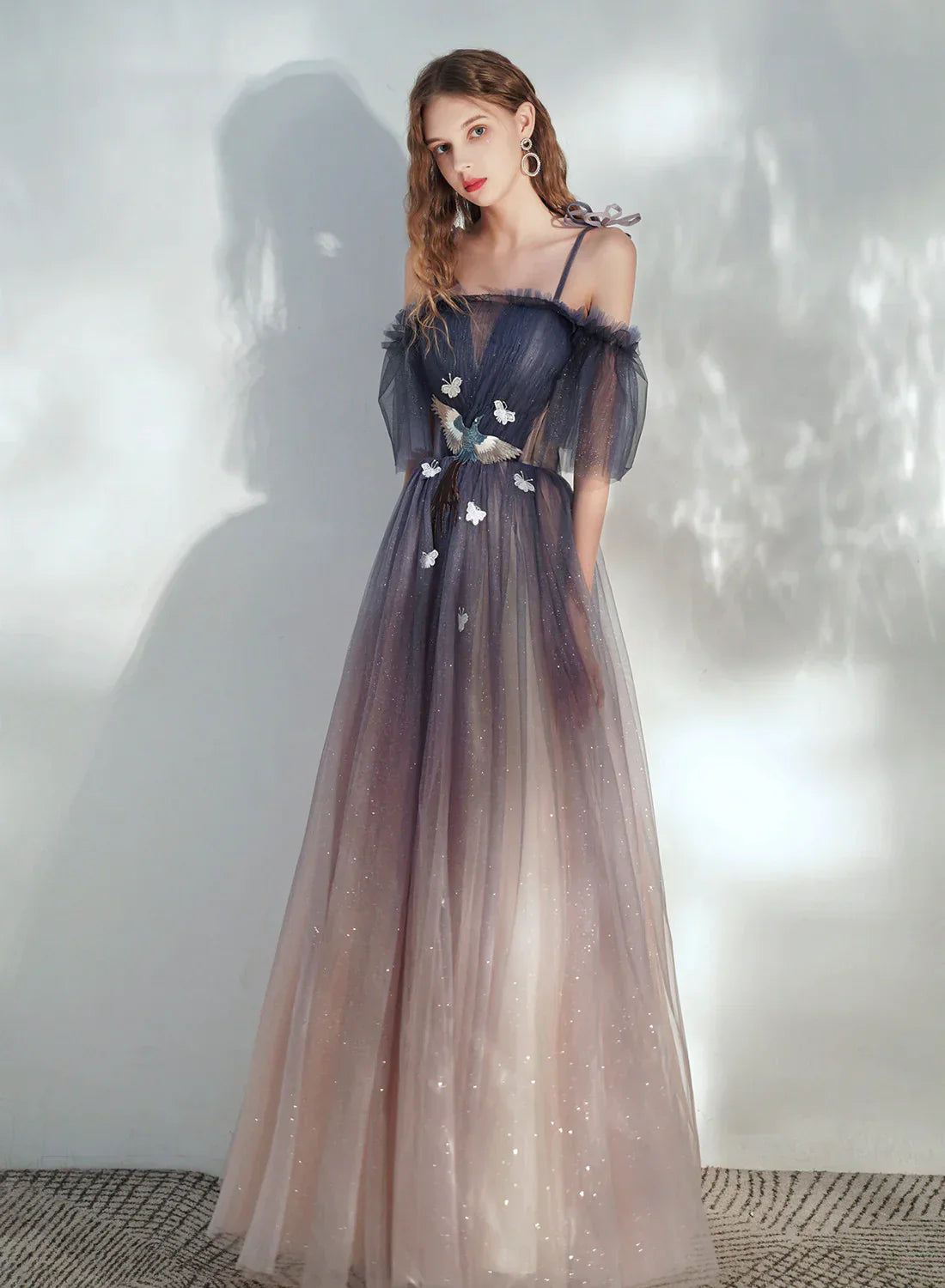 Beautiful Gradient Tulle Off Shoulder with Butterflies, A-line Simple Long Prom Dress