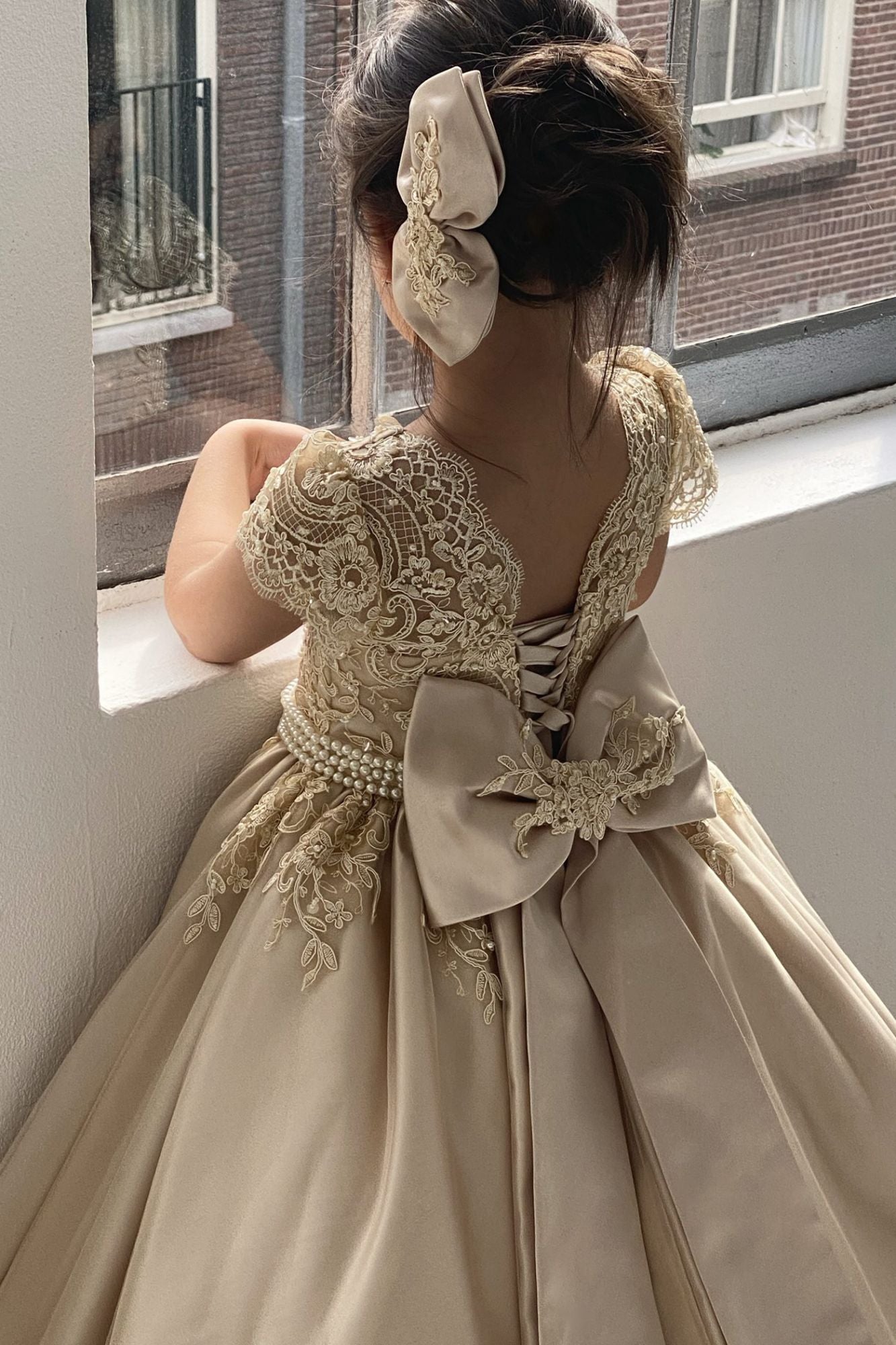 Beautiful Lace Appliques Bow Ruffles Pearls Short Sleeve Ball Gown Backless Flower Girl Dress