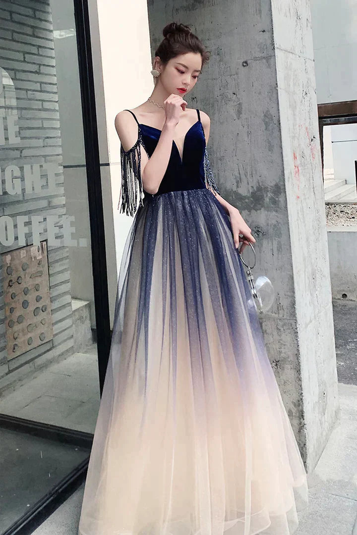 Beautiful Tulle Blue Gradient V-neckline Straps Prom Dress, A-line Tulle Formal Dress