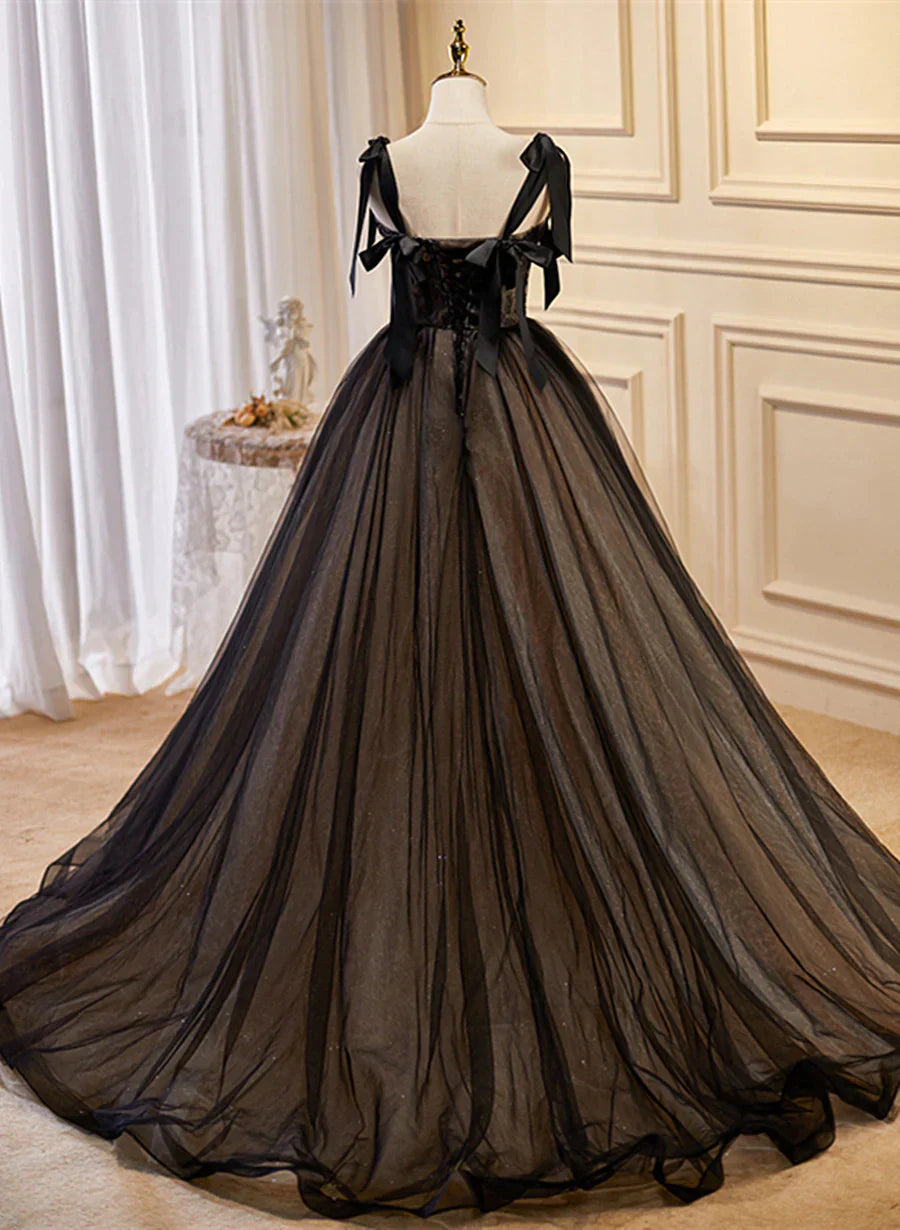 Black Straps Tulle with Lace Long Formal Dress, Black A-line Prom Dress