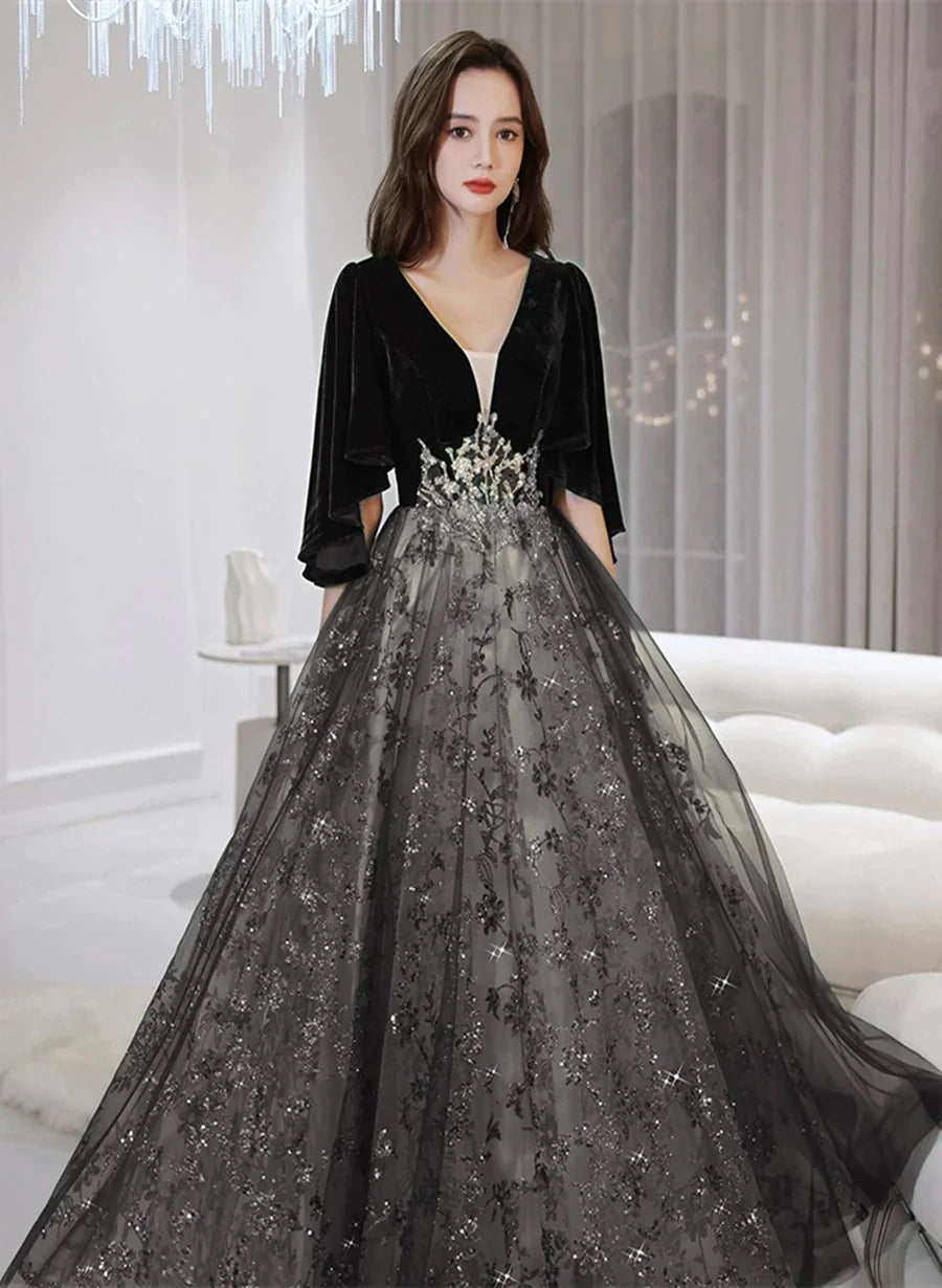Black Tulle and Velvet Chic Long A-line Prom Dress, Black Formal Dress