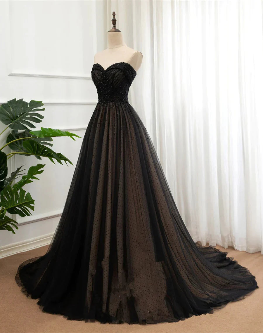 Black Tulle Sweetheart A-line Formal Dress with Lace, Black Long Prom Dress
