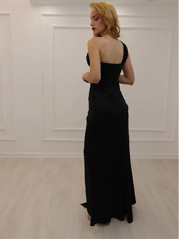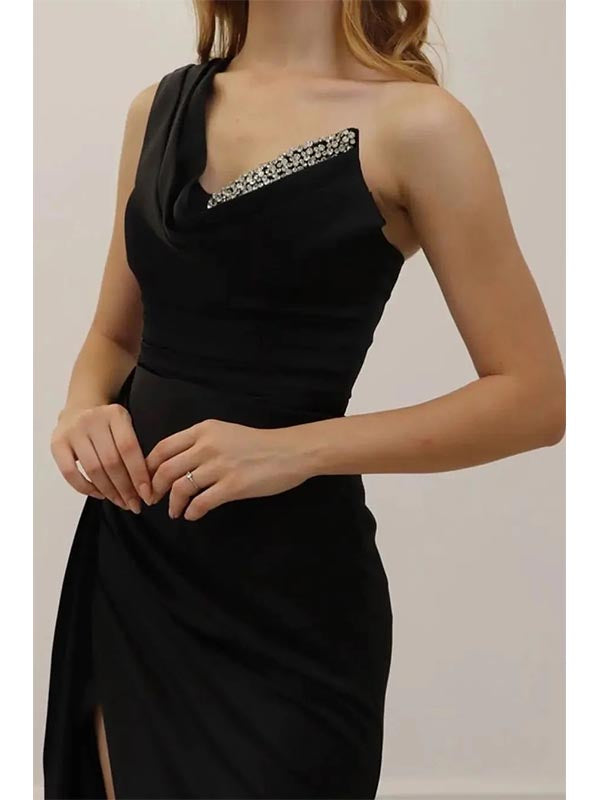 Black V-neck A-line Beaded Side Slit Long Prom Dress, OL667