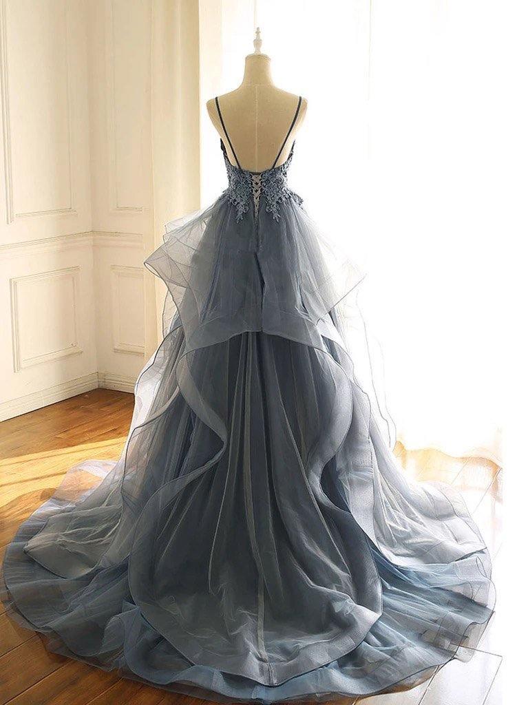 Blue Gray Lace V Neck Long Ruffles Prom Dress Open Backs Evening Dresses