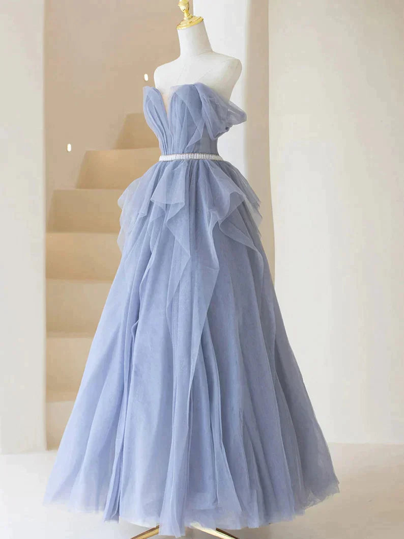 Blue Sweetheart Tulle Off-the-Shoulder Floor-Length Prom Dresses, Blue Evening Gown