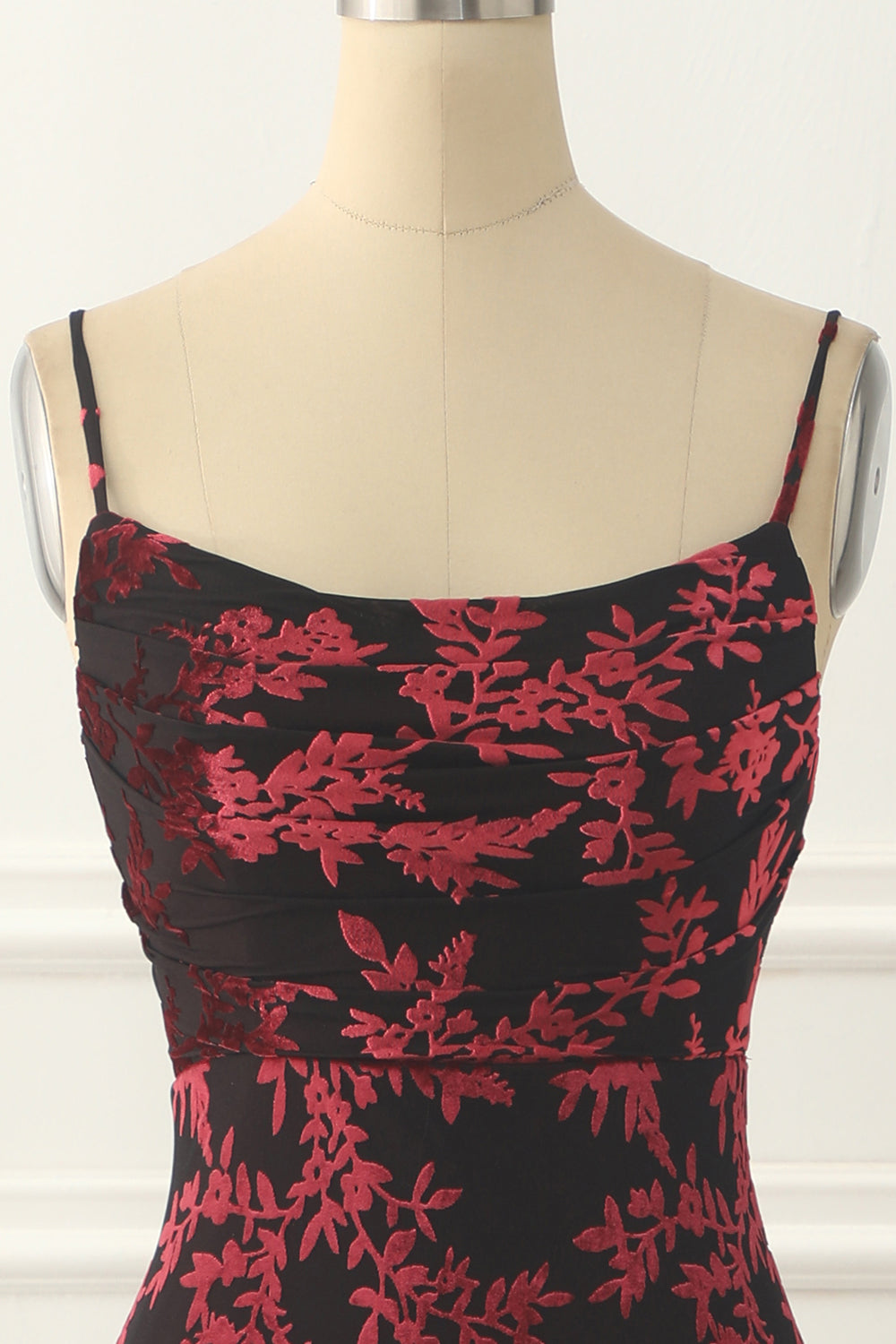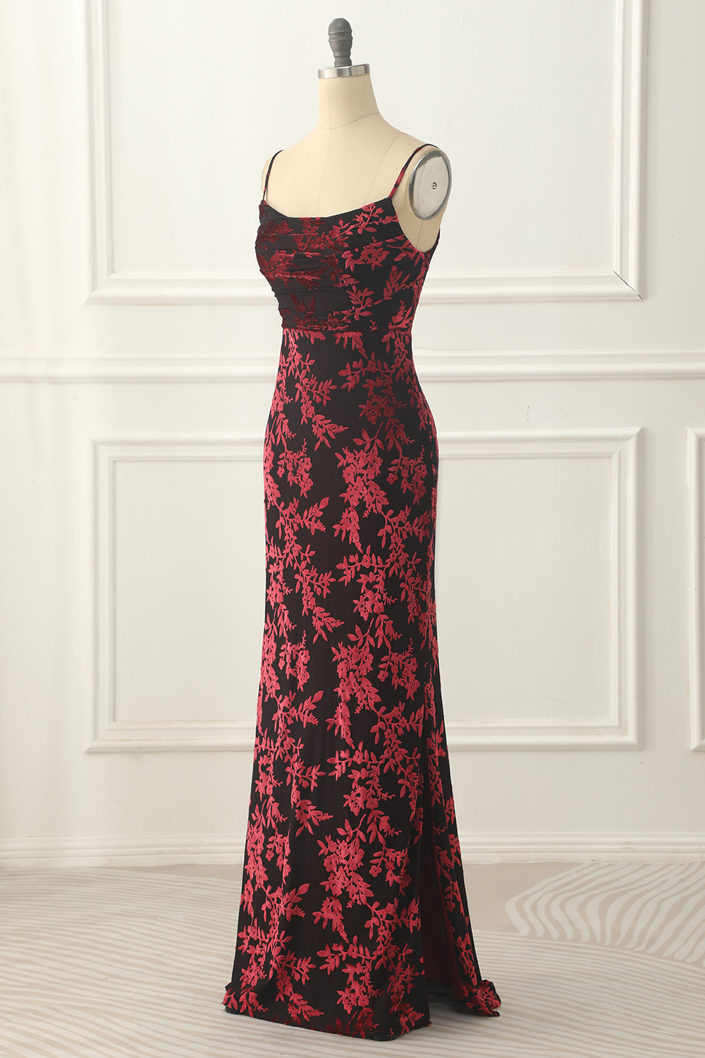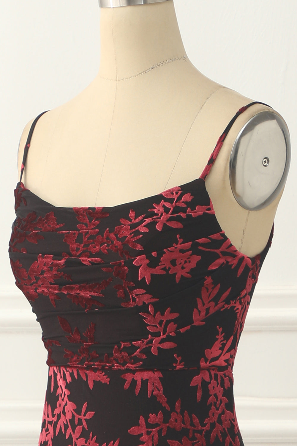 Burgundy Sheath Floral Burnout Velvet Prom Dress Long