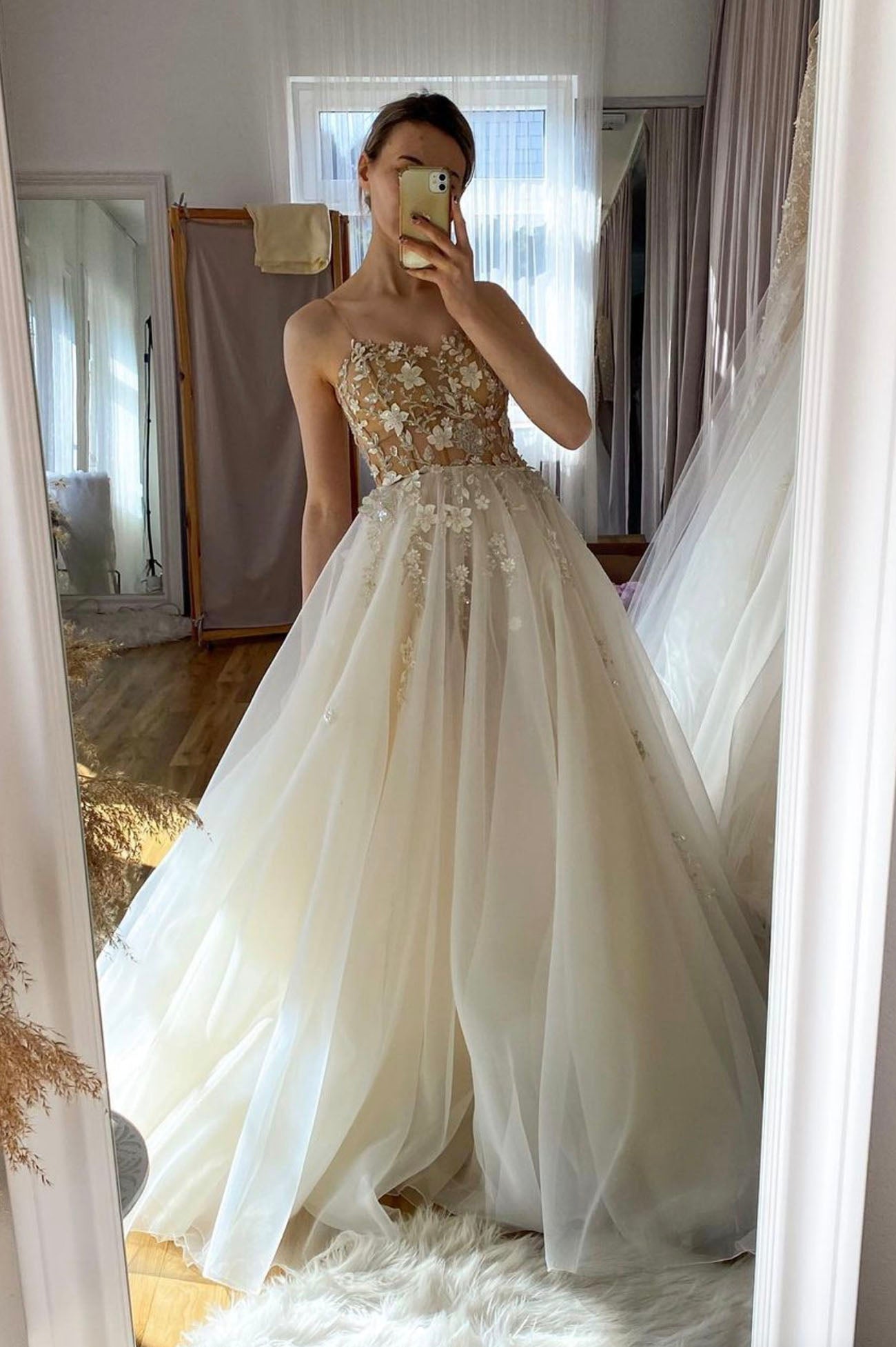 Champagne Spaghetti Strap Lace Long Prom Dresses, A-Line Evening Dress