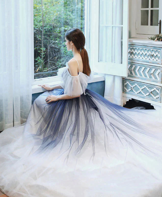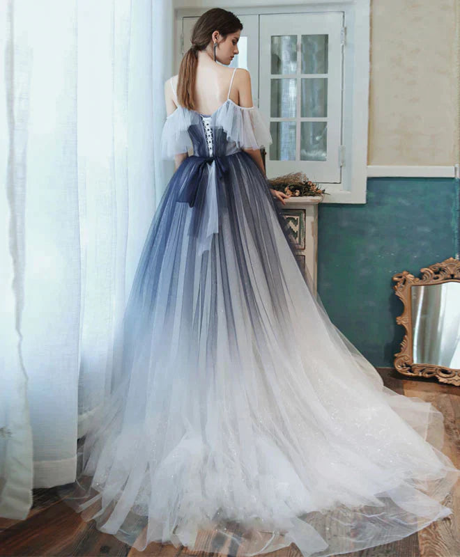 Charming Blue Gradient Straps Long Junior Prom Dress, Blue Formal Gown Evening Dresses