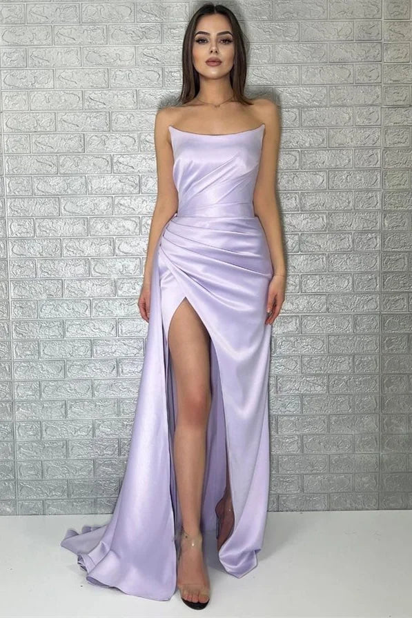 Chic Light Lilac Strapless Mermaid Evening Dresses Pleats Long Split With Ruffle