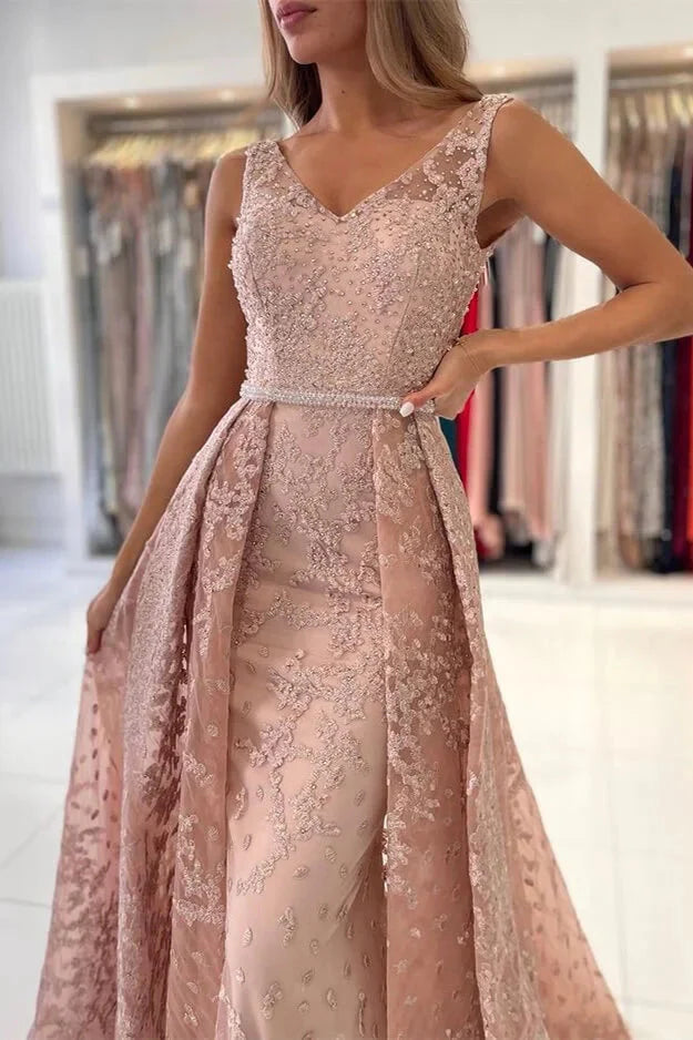 Classy Dusty Pink V-Neck Evening Dress Sleeveless Lace Appliques Overskirt