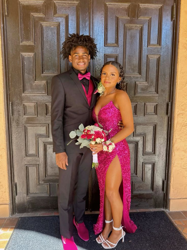 Classy Hot Pink Sequin Prom Dress High Slit Graduation Dresses
