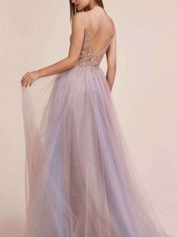 Sexy Deep V-neck Spaghetti Straps Tulle Prom Dress with Side Slit, DB11006