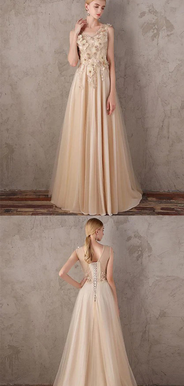 Elegant A-ine V-neck Applique Tulle Prom Dress, DB10910