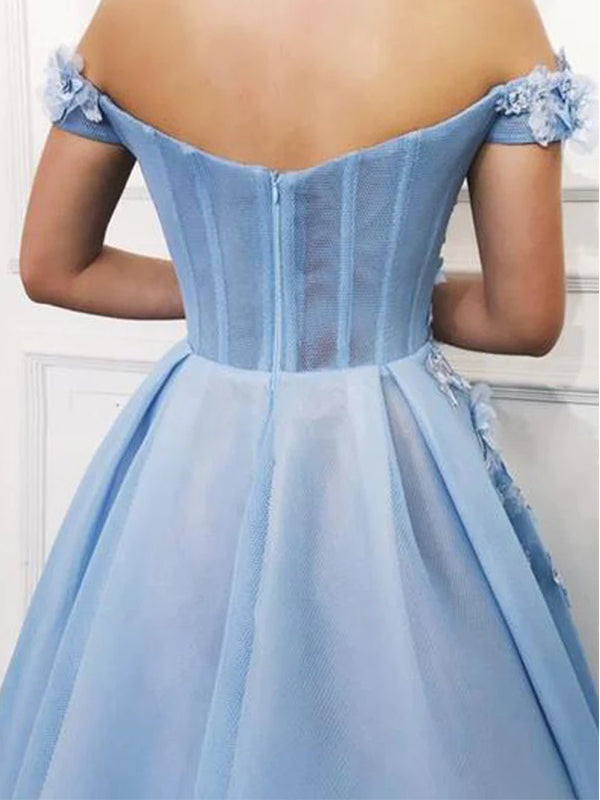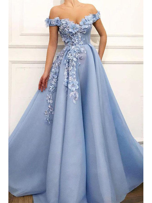 Elegant Blue Off the Shoulder Satin Flower A-line Long Prom Dresses Formal Dress, OL802