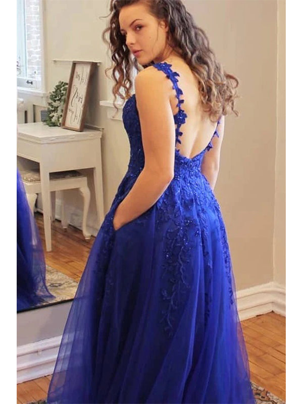 Elegant Blue Spaghetti Straps V-neck Backless Tulle A-line Long Prom Dresses, OL826