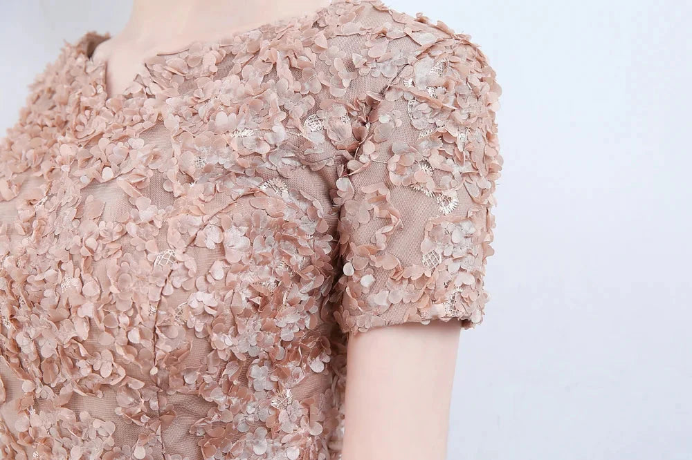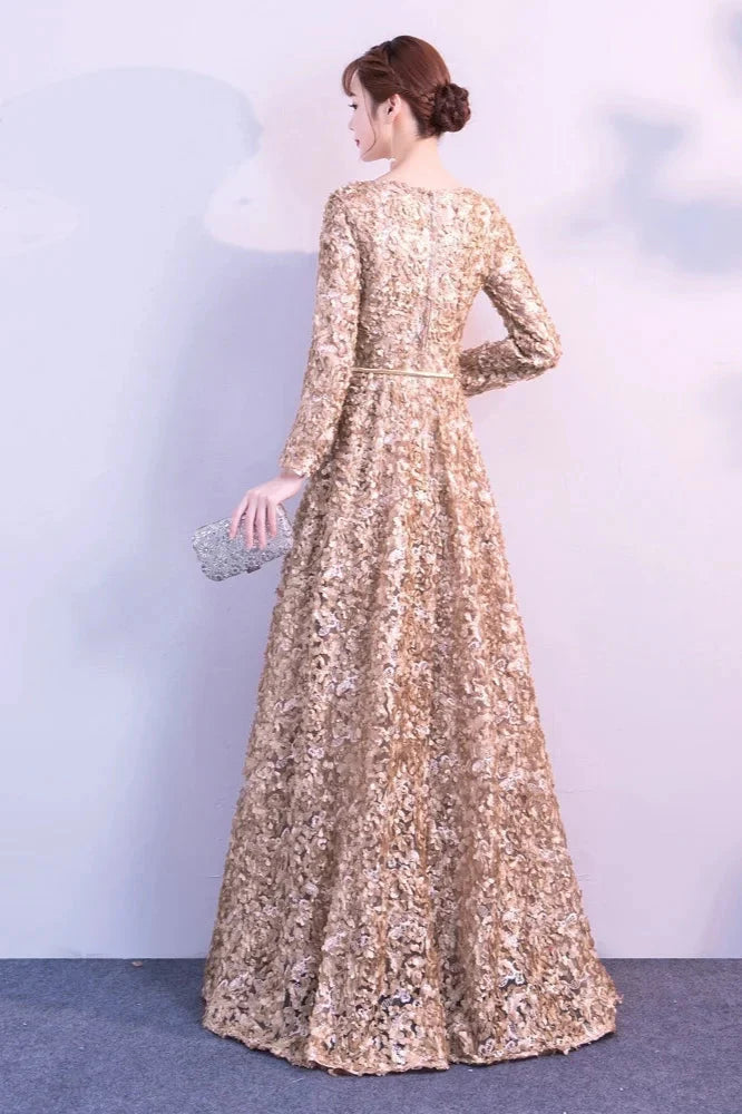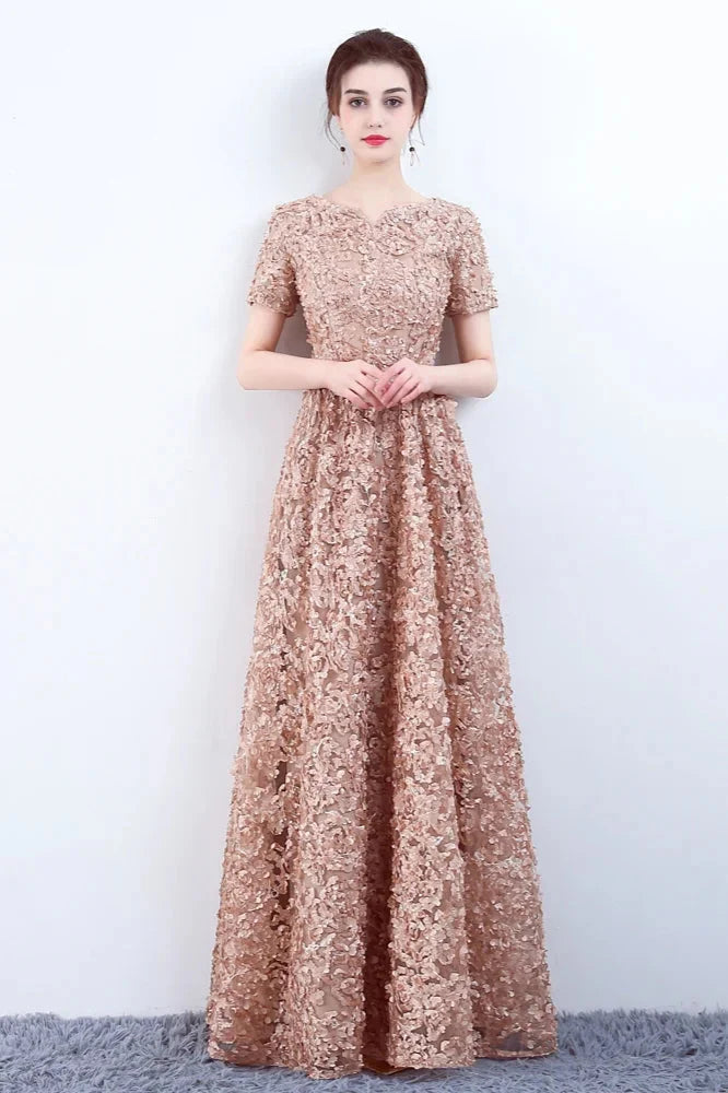 Elegant Short Or Long Sleeves Lace Evening Gowns Online Zipper Back With Belt