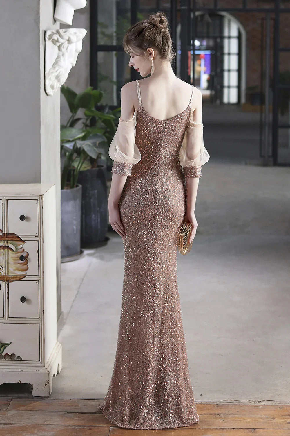 Elegant Spaghetti-Straps V-Neck Sequined Evening Formal Dress Mermaid With Bubble Tulle Sleeves