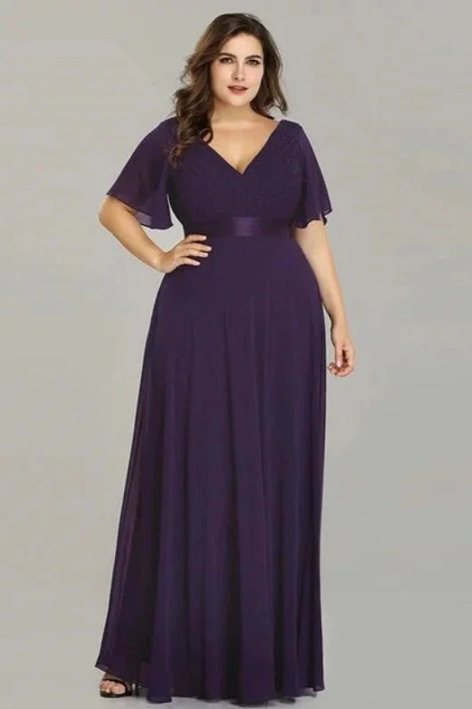 Elegant V-Neck Plus Size Chiffon Evening Dress With Short Sleeves