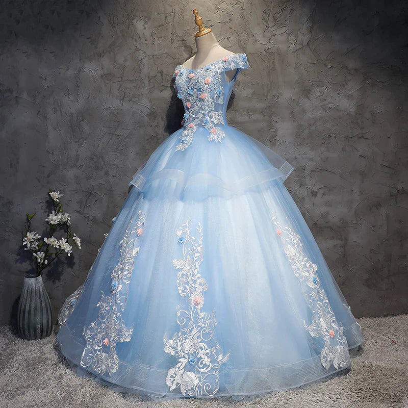 Glam Blue Ball Gown Tulle with Lace and Flowers Sweet 16 Dress, Blue Formal Dress