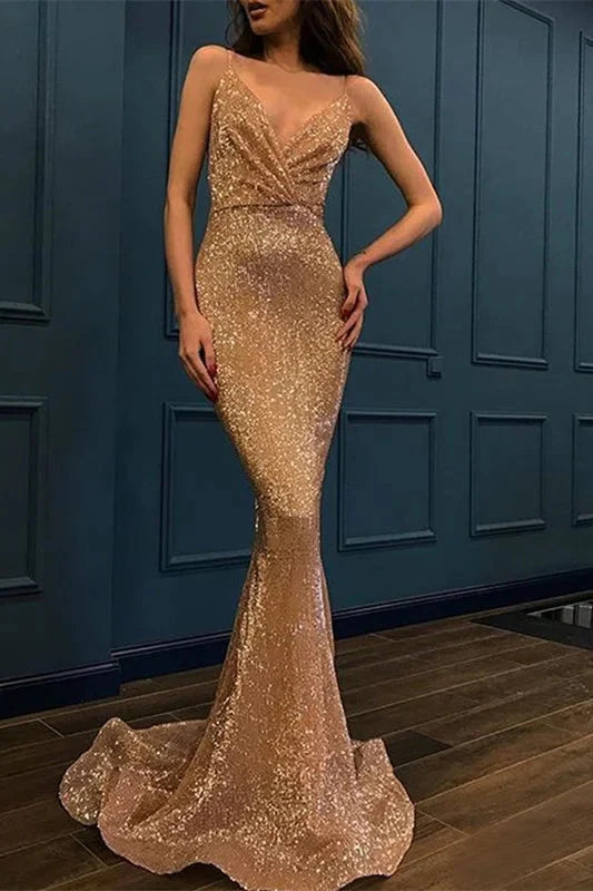 Glamorous Spaghetti-Straps Sequins V-Neck Prom Dress Mermaid Evening Gowns