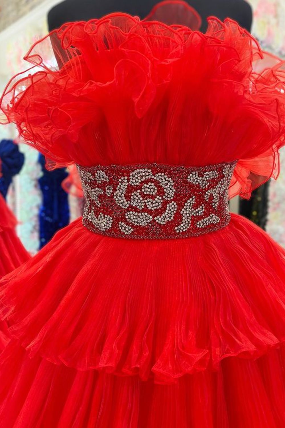 Glitter A-Line Beaded Long Tulle Tiered Prom Dress with Ruffles Off Shoulder