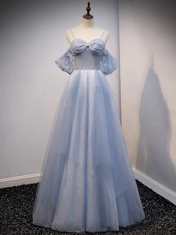 Glitter A-Line Princess Off Shoulder Tulle Gray Blue Long Prom Dress Sparkly Evening Dress