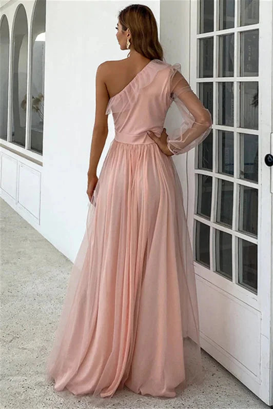 Glorious One Shoulder Pink Evening Dress Long Sleeves A-Line