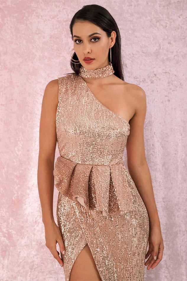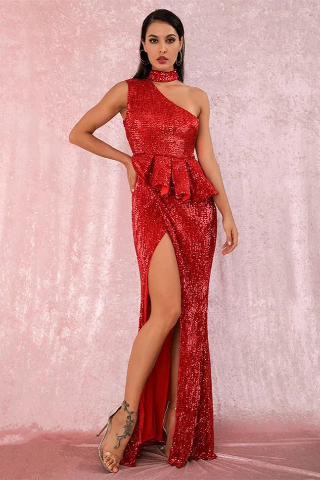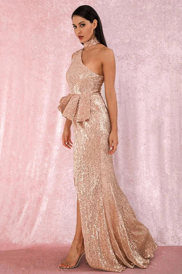 Gorgeous High-Neck One Shoulder Sequins Prom Dress Long Evening Party Gowns With Split
