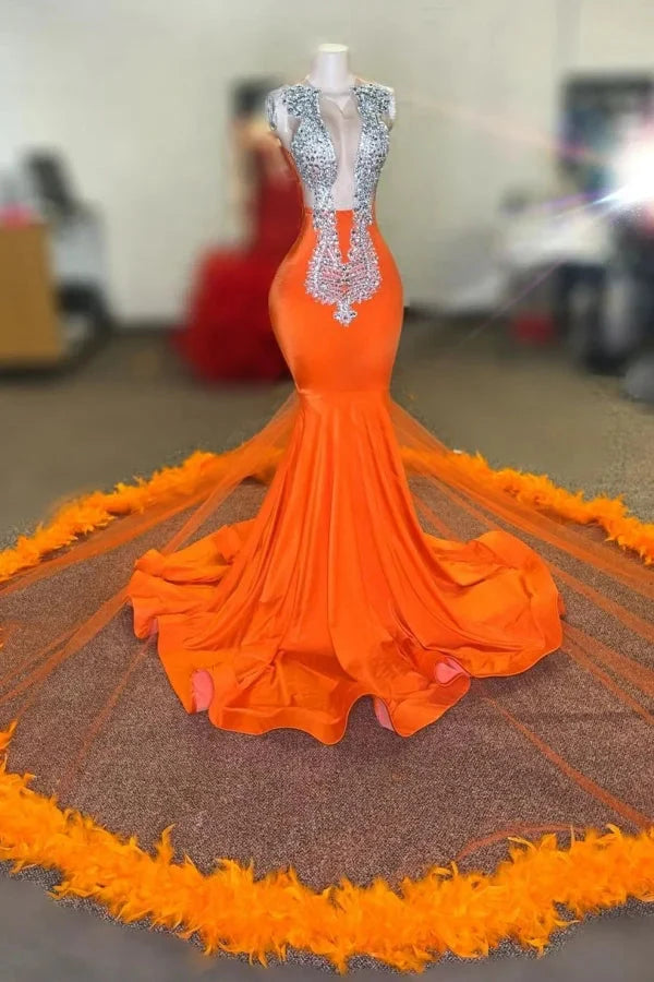 Gorgeous Orange Mermaid Evening Dress Sleeveless With Feather Crystal