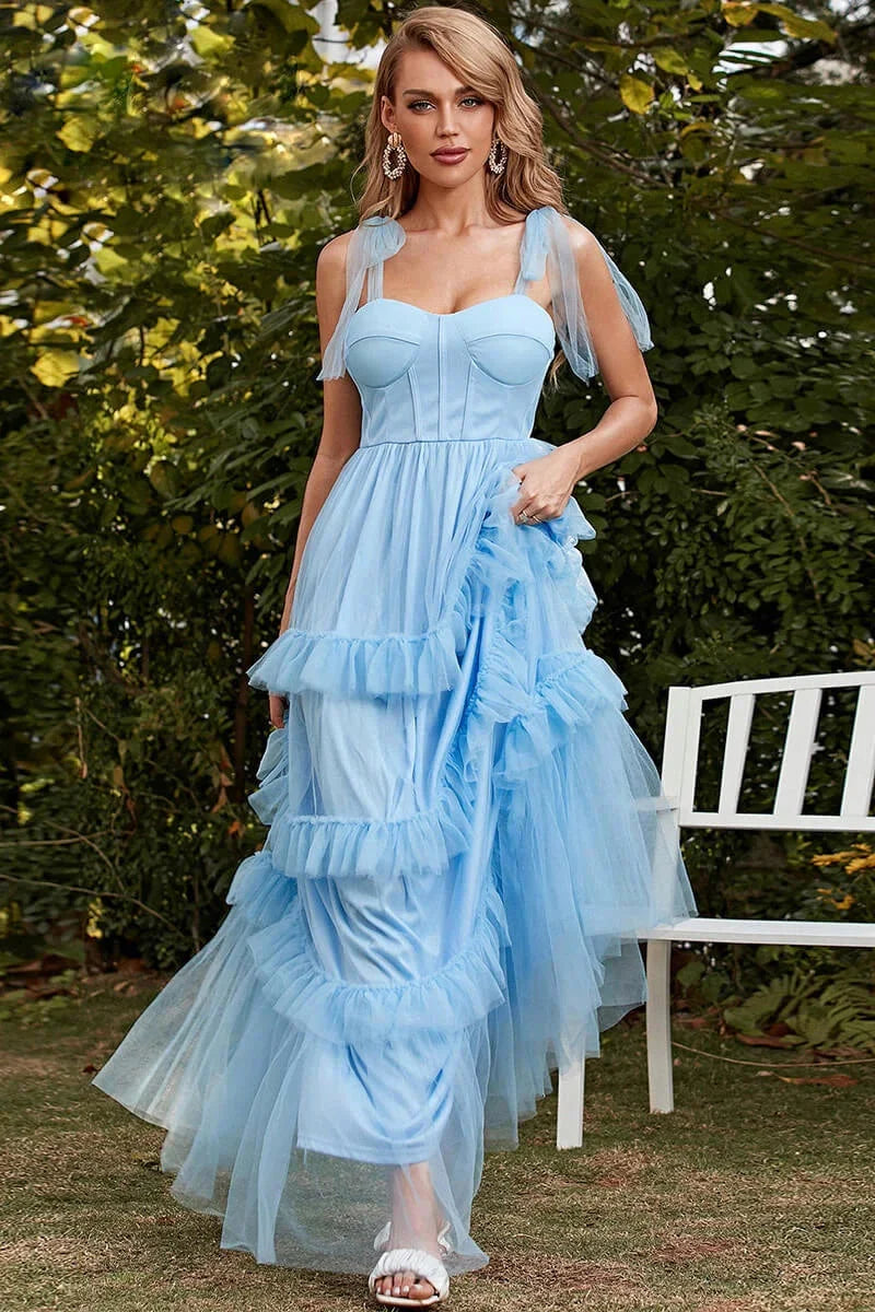 Gorgeous Sky Blue Straps Sweetheart Evening Dress Long Tulle Layered